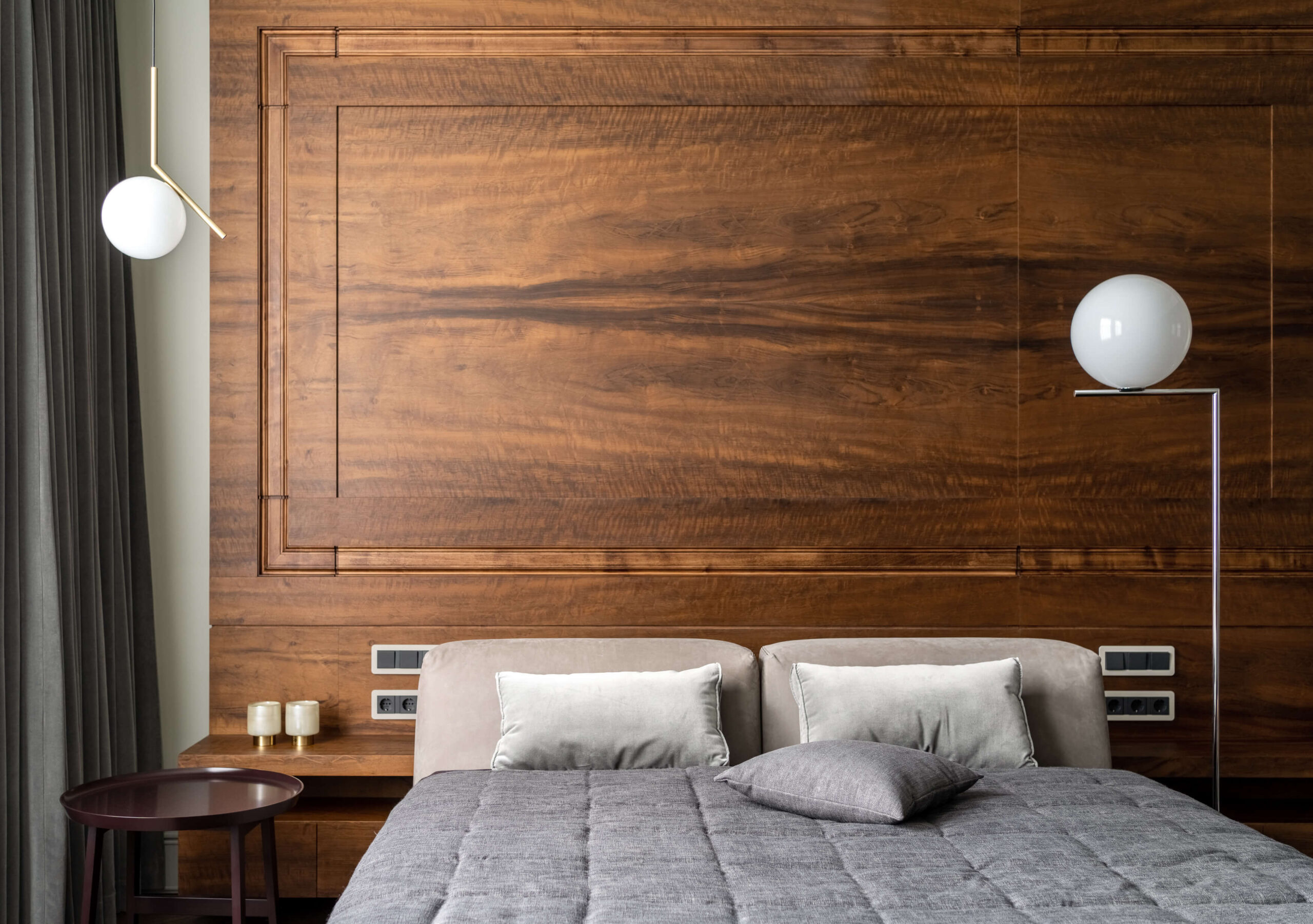 ПопереднійРеалізований проєкт від студії дизайну та архітектури Replus bureau, в якому поєднали класичні форми з сучасним технологічним наповненням. Стінова панель виготовлена із шпону Імбуя – додає особливого акценту спальні. Даний вид шпону є ексклюзивним для архітектурної обробки деревини та додає вишуканості інтер’єру.