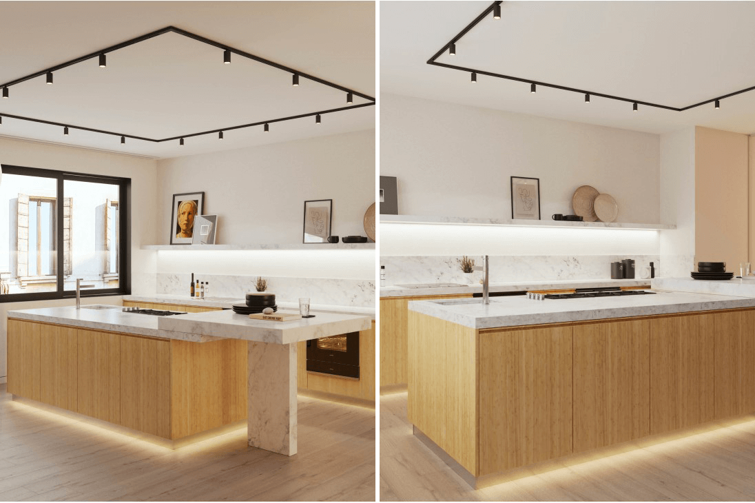 The interior of the presented kitchen is filled with light and soft colors. The kitchen space is used to maximum advantage not only for practicality but also for convenient care. A separate bright feature is veneered facades, which complement the room with naturalness and naturalness. These shades help to relax, giving warmth and comfort. Kitchen lighting combined with soft colors gives the room freshness and balance.