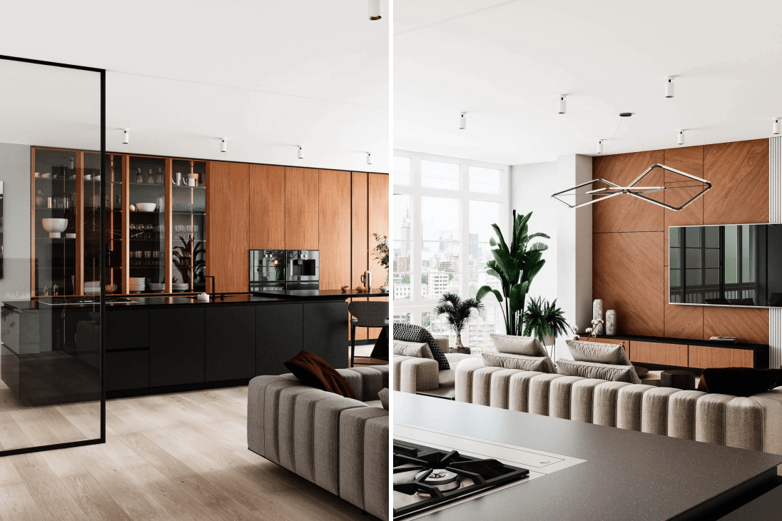 Интерьер объединенных просторных помещений является одним из популярных приемов дизайнеров. Сегодня каждый может реализовать свои замыслы и создать красивый дизайн кухни совмещенной с гостиной. Дополнение одного другим, могут быть: деревянные панели, встроенная мебель и декоративная стена, как декоративная функция или функция зонирования. Барная стойка — может визуально разделять пространство, вносить упорядоченность между помещениями. В выполненном проекте использовали на МДФ основу — натуральный шпон ДЖАТОБА, из тропического вечнозеленого дерева. Шпонированные фасады покрыты новинкой Verinlegno, из ряду акриловых, прозрачных, матовых лаков – ACRYSTONE PLUS 5312 Е. Чрезвычайная твердость и устойчивость лака защитит кухонную мебель от царапин, химических и моющих средств, алкоголя, жира и горячей посуды. Именно этот продукт придаст изделиям из шпона практичности, а благодаря УФ-фильтрам обеспечит неизменным цветом на долгие годы.