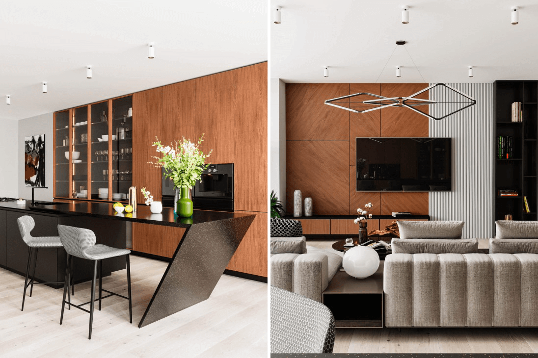 Интерьер объединенных просторных помещений является одним из популярных приемов дизайнеров. Сегодня каждый может реализовать свои замыслы и создать красивый дизайн кухни совмещенной с гостиной. Дополнение одного другим, могут быть: деревянные панели, встроенная мебель и декоративная стена, как декоративная функция или функция зонирования. Барная стойка — может визуально разделять пространство, вносить упорядоченность между помещениями. В выполненном проекте использовали на МДФ основу — натуральный шпон ДЖАТОБА, из тропического вечнозеленого дерева. Шпонированные фасады покрыты новинкой Verinlegno, из ряду акриловых, прозрачных, матовых лаков – ACRYSTONE PLUS 5312 Е. Чрезвычайная твердость и устойчивость лака защитит кухонную мебель от царапин, химических и моющих средств, алкоголя, жира и горячей посуды. Именно этот продукт придаст изделиям из шпона практичности, а благодаря УФ-фильтрам обеспечит неизменным цветом на долгие годы.