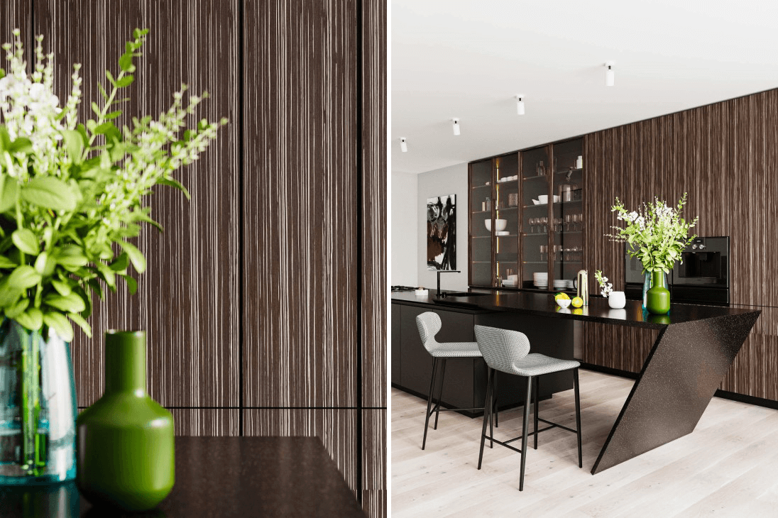 В выполненном проекте использовали на МДФ основу — модифицированный шпон ЗЕБРАНО КАПУЧИНО. Шпонированные фасады покрыты новинкой Verinlegno, по ряду акриловых, прозрачных, матовых лаков — ACRYSTONE PLUS 5312 Е. Чрезвычайная твердость и устойчивость лака защитит кухонную мебель от царапин, химических и моющих средств, алкоголя, жира и горячей посуды. Именно этот продукт придаст изделиям из шпона практичности, а благодаря УФ-фильтрам обеспечит неизменным цветом на долгие годы.