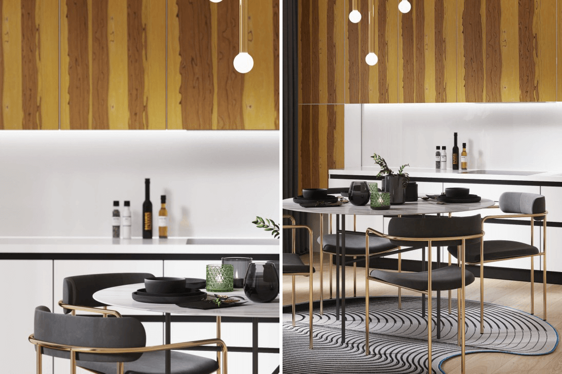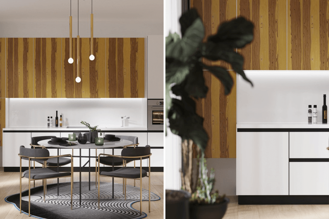 Создай исключительную красоту посреди будней! Благодаря динамике линий мы передаем неповторимую красоту натуральных фасадов созданных с модифицированного шпона ЭБЕН МАКАССАР БЕЛЫЙ. Живой материал шпона от Classic Veneer и чистые линии создают настроение всего интерьера.