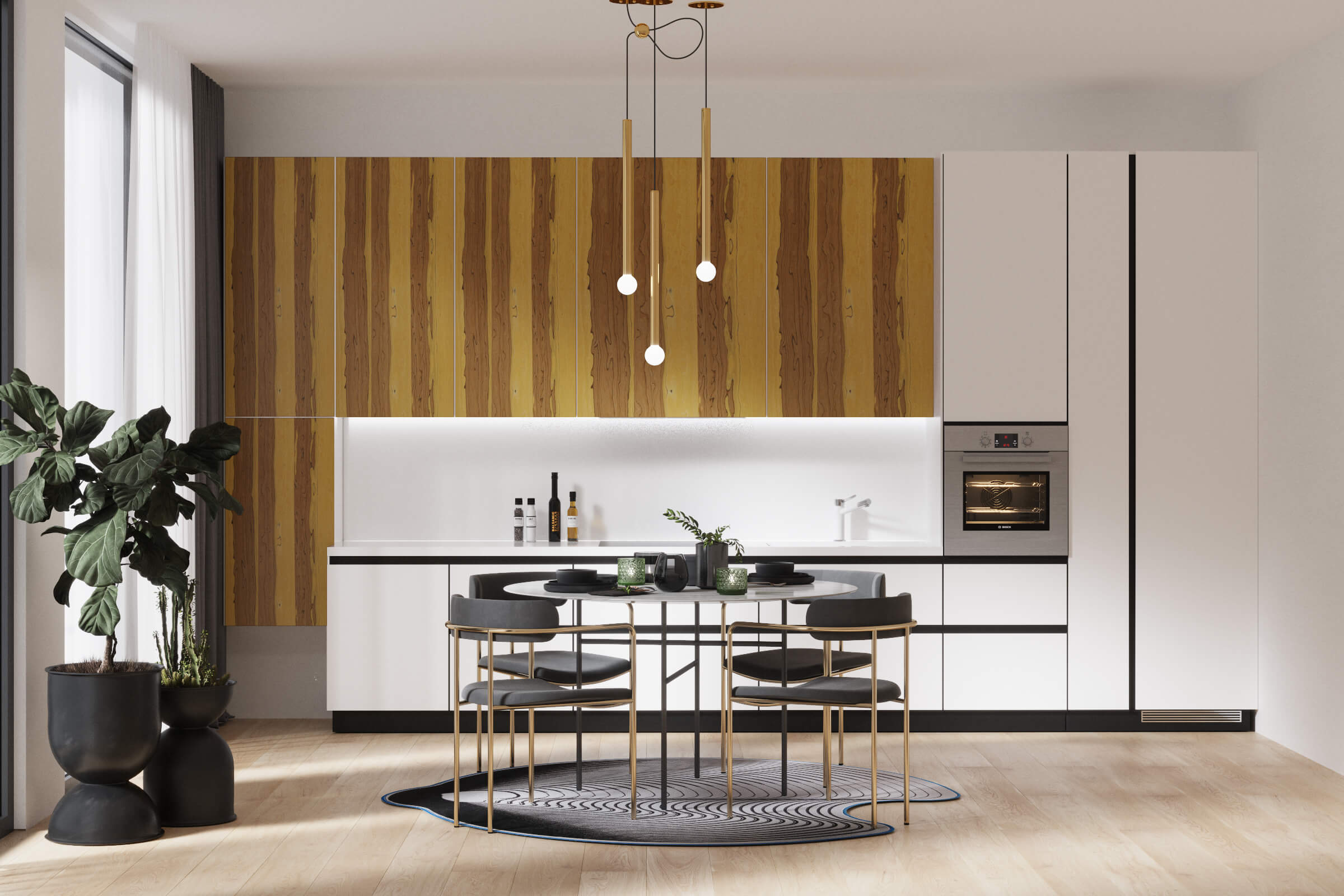 Создай исключительную красоту посреди будней! Благодаря динамике линий мы передаем неповторимую красоту натуральных фасадов созданных с модифицированного шпона ЭБЕН МАКАССАР БЕЛЫЙ. Живой материал шпона от Classic Veneer и чистые линии создают настроение всего интерьера.