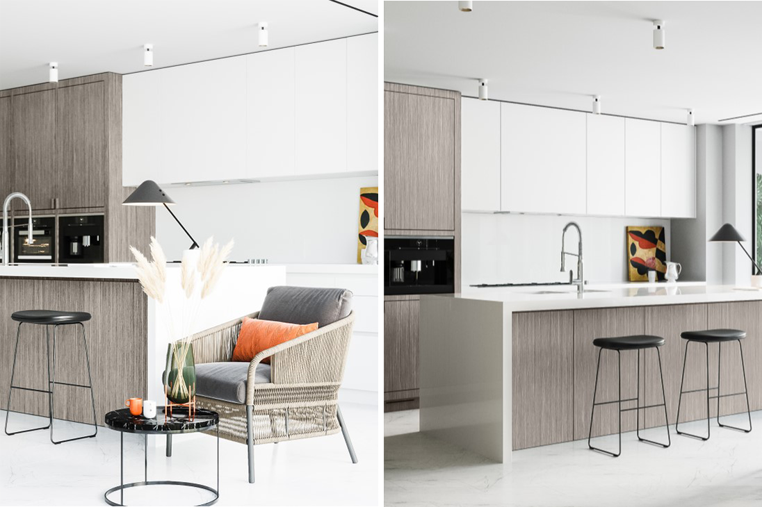 Для представленного проекта использовали на МДФ основу — модифицированный шпон ОРЕХ КАПРИ, из новой коллекции шпона 2019 Classic Veneer. Шпонированные фасады покрыты ACRYSTONE PLUS 5312 E – двухкомпонентным, акриловым, прозрачным, матовым лаком. Благодаря чрезвычайной твердости и стойкости лака кухонная мебель будет защищена от царапин, химических и моющих средств, алкоголя, жира и горячей посуды. Именно этот продукт придаст Вашей кухне практичности, а благодаря УФ-фильтрам обеспечит неизменным цветом на долгие годы.
