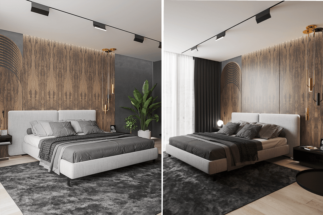 Лаконичность — главная черта интерьера спальни в современном стиле. Обработка пола, фасадов, стен из натуральных материалов является идеальным способом для создания успокаивающей атмосферы в зонах отдыха.