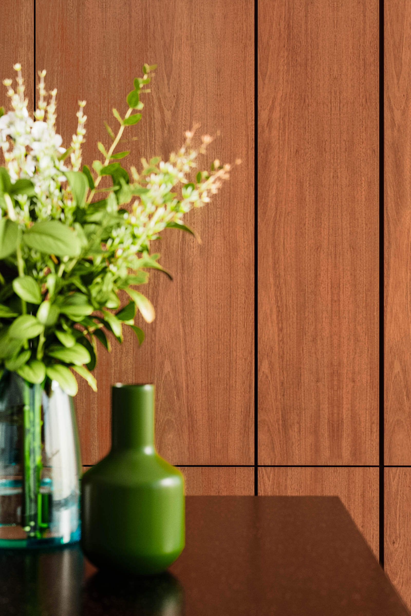 Дерев’яні панелі можуть бути вдалим доповненням для вашого інтер’єру. а також виконувати декоративну функцію чи функцію зонування. У виконаному проекті використовували на МДФ основу – натуральний шпон ДЖАТОБА, з тропічного вічнозеленого дерева. Шпоновані фасади покриті новинкою Verinlegno, з ряду акрилових, прозорих, матових лаків – ACRYSTONE PLUS 5312 Е. Надзвичайна твердість та стійкість лаку захистить кухонні меблі від подряпин, хімічних та миючих засобів, алкоголю, жиру та гарячого посуду. Саме цей продукт додасть виробам із шпону практичності, а завдяки УФ–фільтрам забезпечить незмінним кольором на довгі роки.