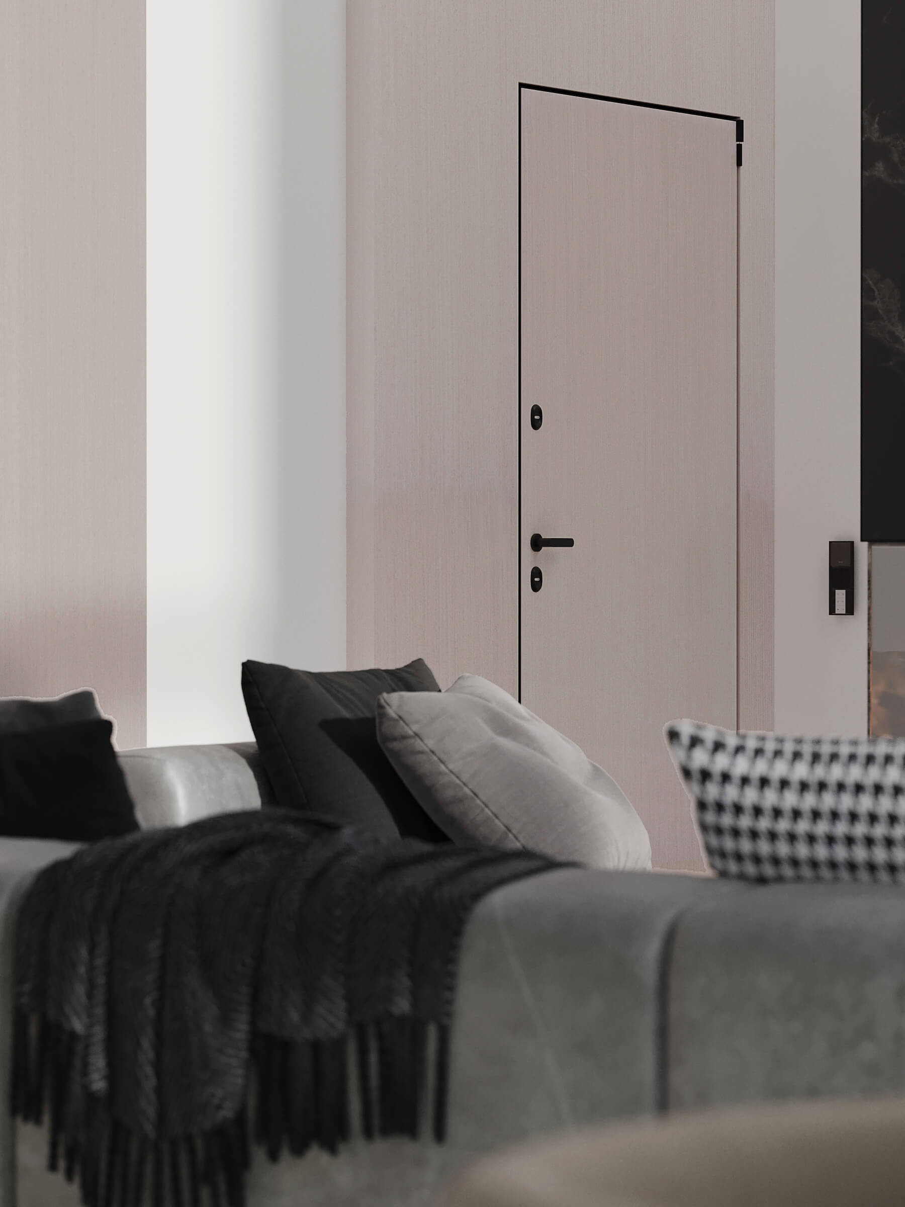 Рівномірна та повторювана текстура шпону ДУБ СІЛЬВЕР (DAS 54) надає будь якому дизайну довершеного вигляду.  Даний вид живого матеріалу має різностороннє застосування в інтер’єрі. У представленому проекті модифікований шпон на прихованих дверях та панелях – зачаровує та надає особливий колорит інтер’єру.