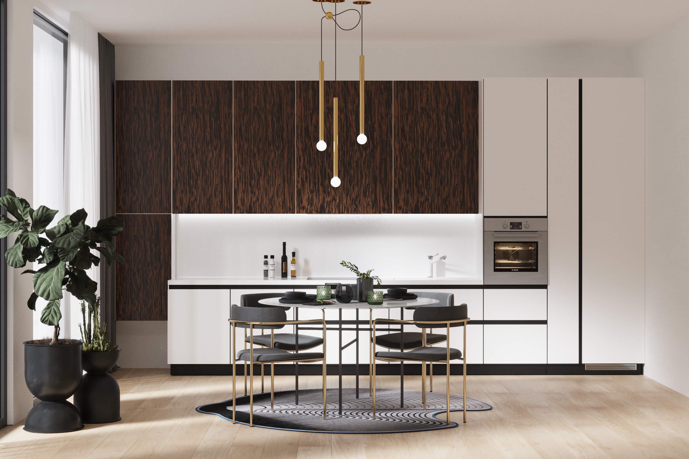 Створи вийняткову красу посеред буднів! Завдяки динаміці ліній ми передаємо неповторну красу натуральних фасадів створених із модифікованого шпону ЕБЕН МАКАСАР. Живий матеріал шпону від Classic Veneer та чисті лінії створюють настрій всього інтер’єру.