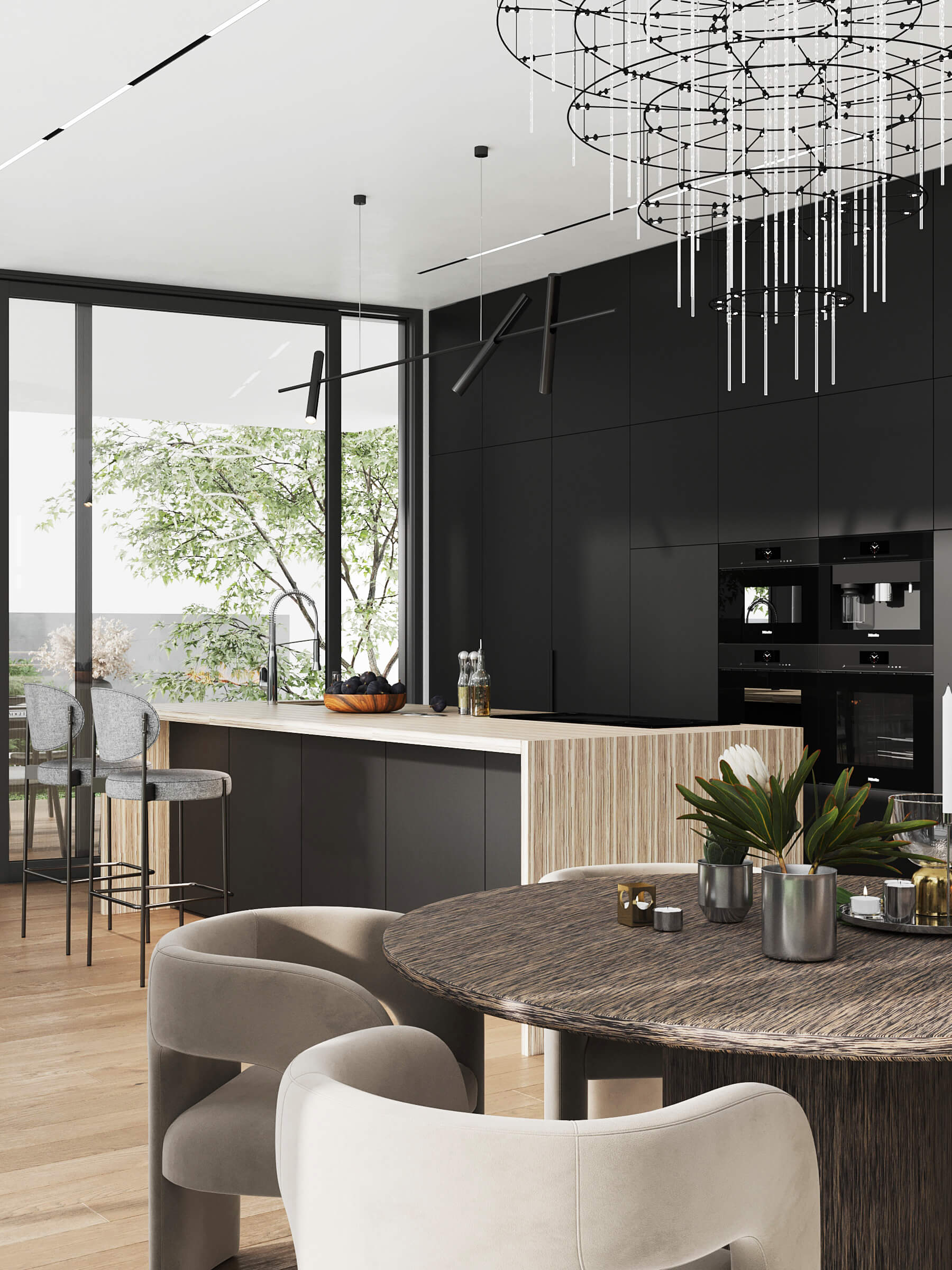 У представленому проекті кухонна стільниця шпонована – ОЛИВКА АЛАНТЕЙО, обідній стіл – ЕБЕН АМАРОНЕ.