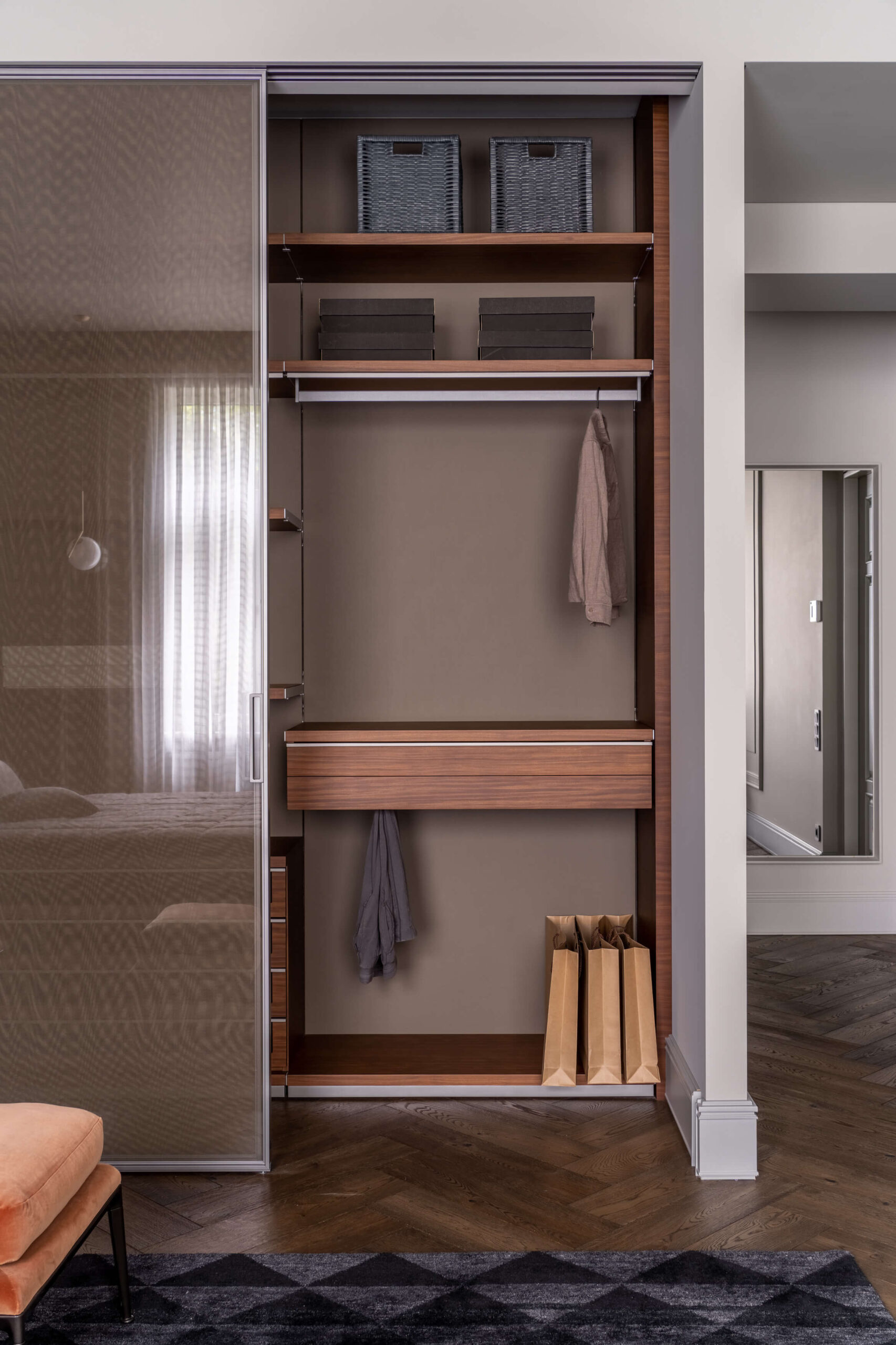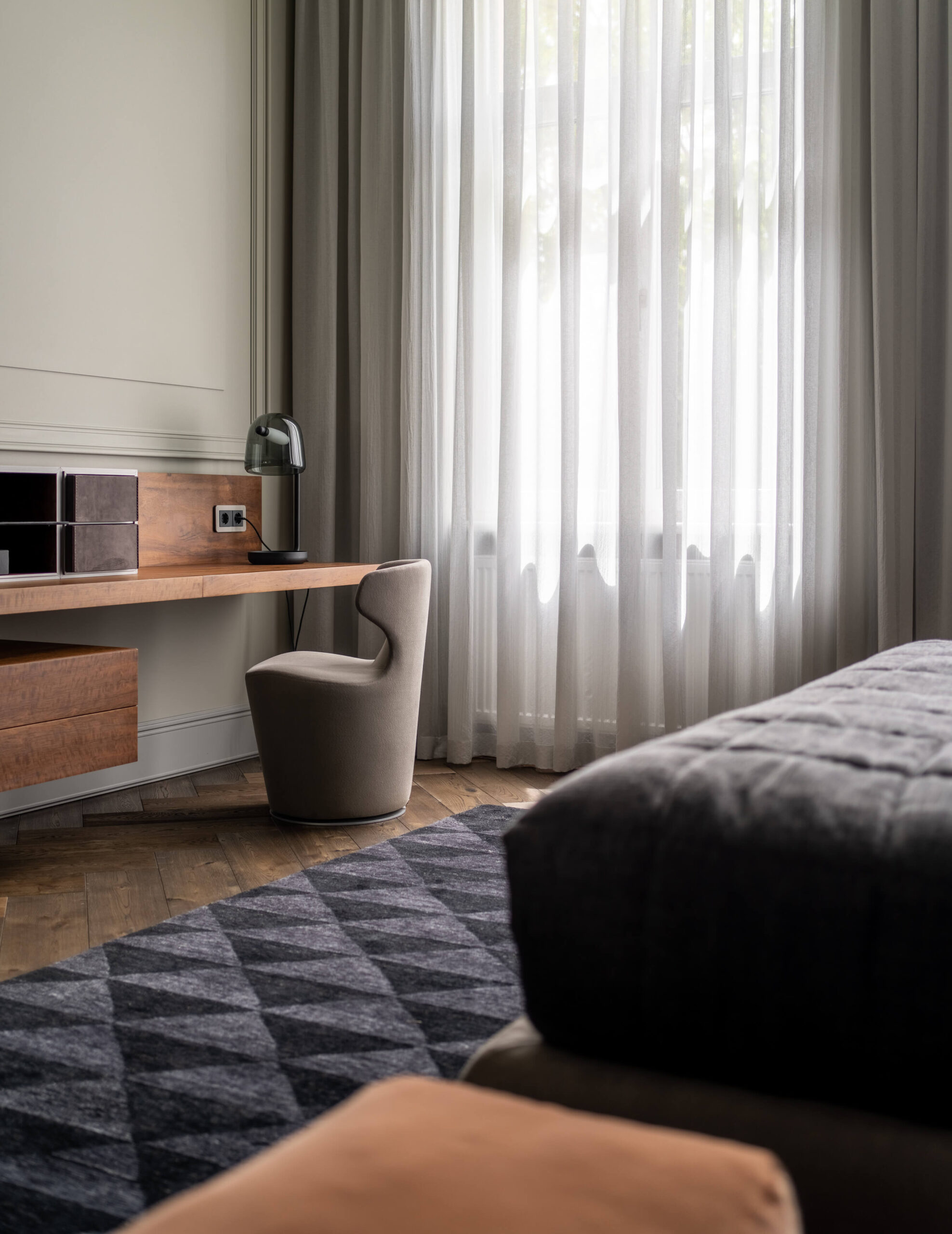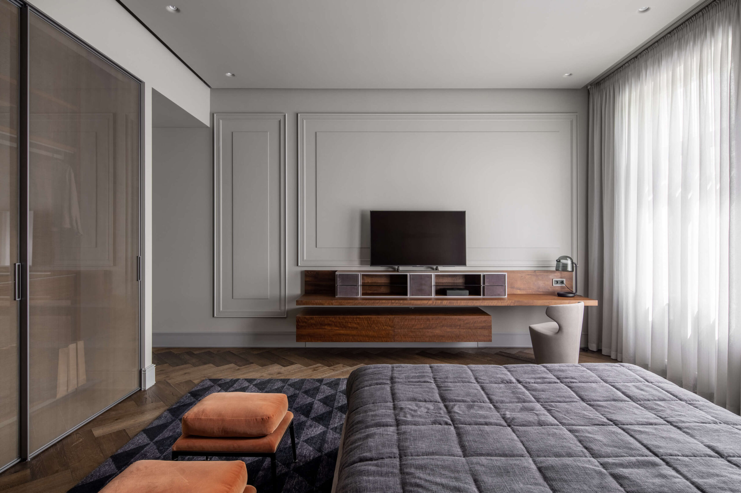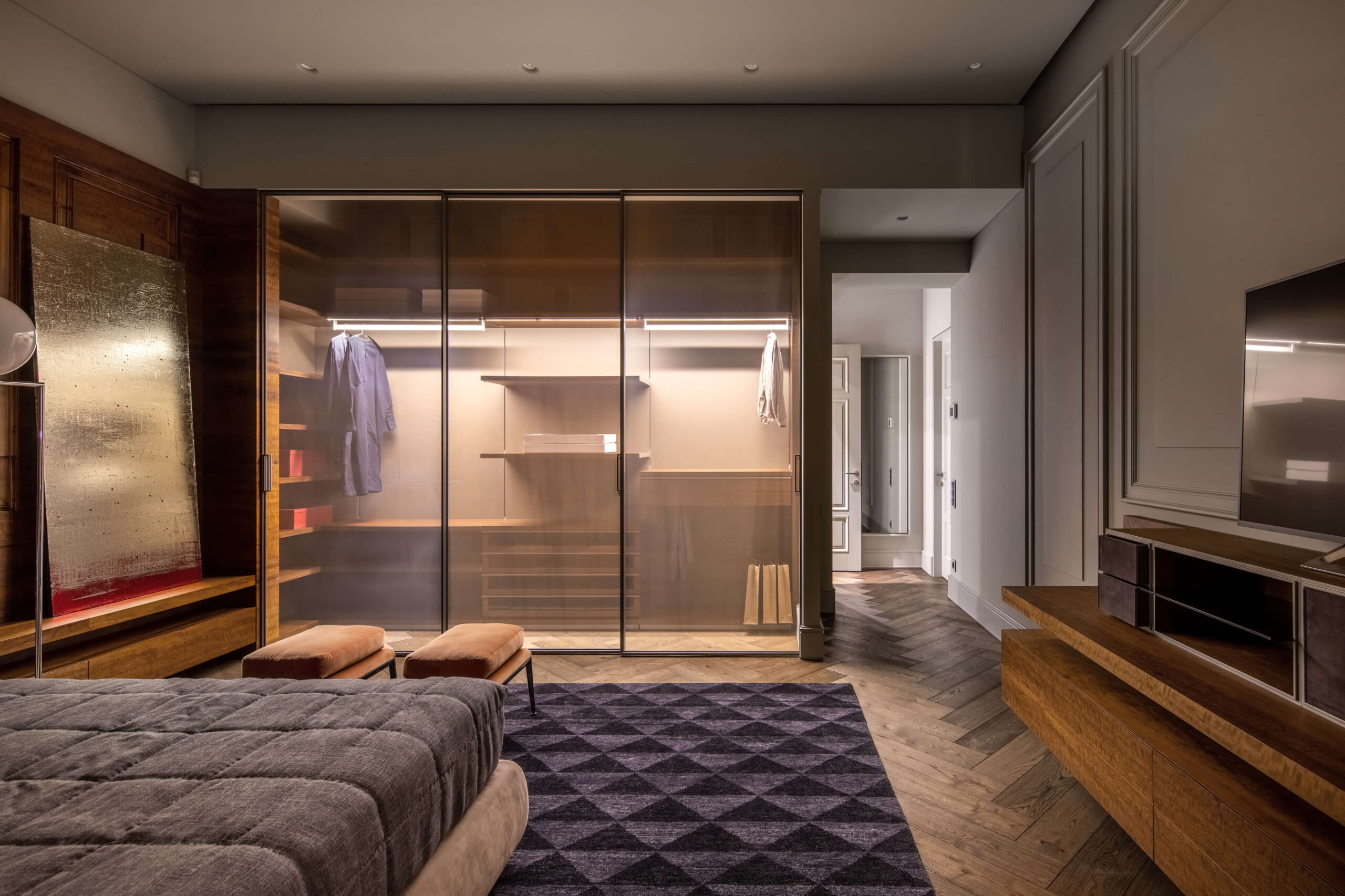 ПопереднійРеалізований проєкт від студії дизайну та архітектури Replus bureau, в якому поєднали класичні форми з сучасним технологічним наповненням. Великий відкритий гардероб, «повітряна» дерев’яна конструкція (не торкається підлоги), яка слугує, як місце для зберігання, косметична зона, а також підставка для невеликого телевізора виготовлені із шпону Імбуя. Даний вид шпону є ексклюзивним для архітектурної обробки деревини та додає вишуканості інтер’єру.