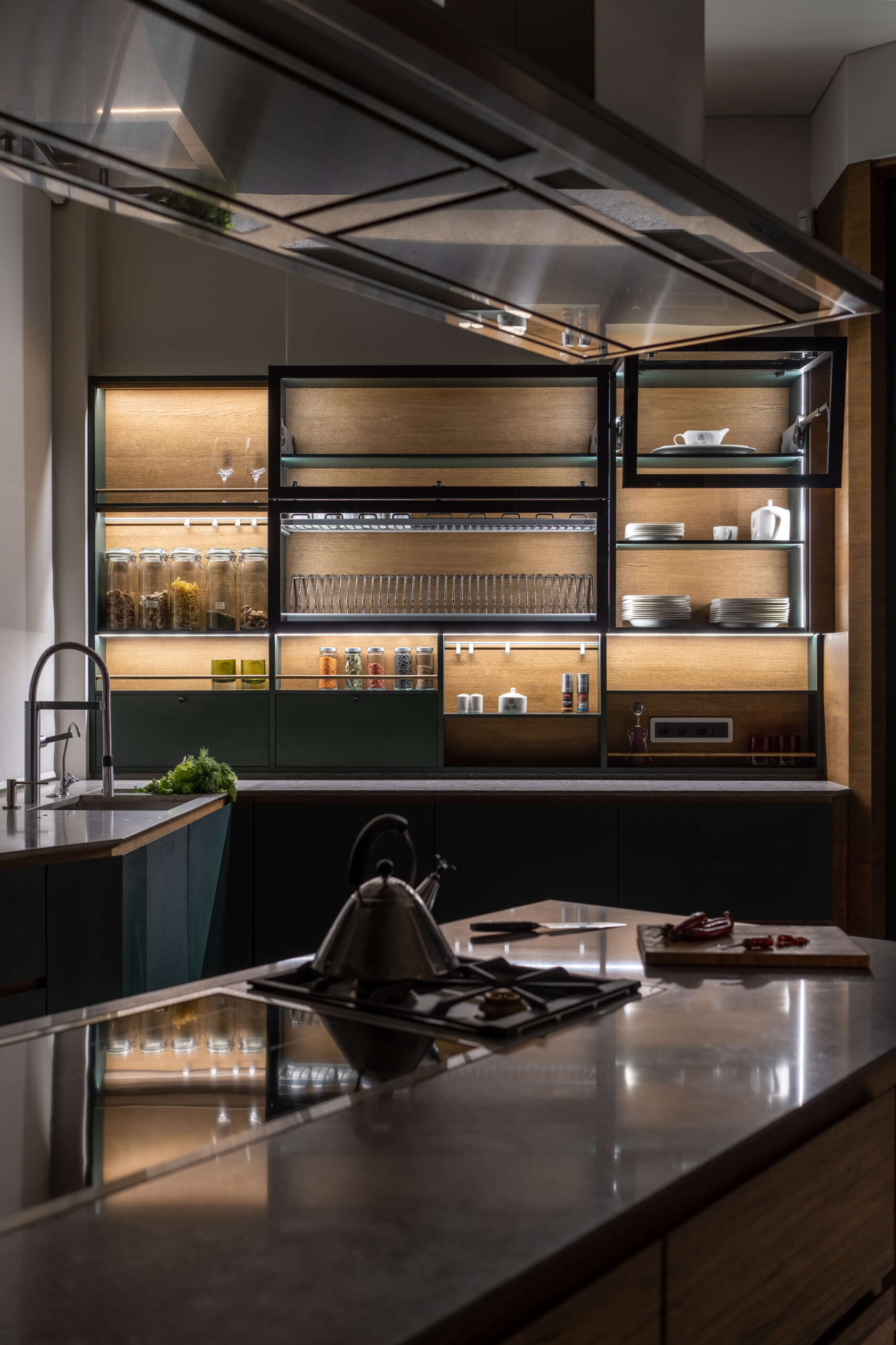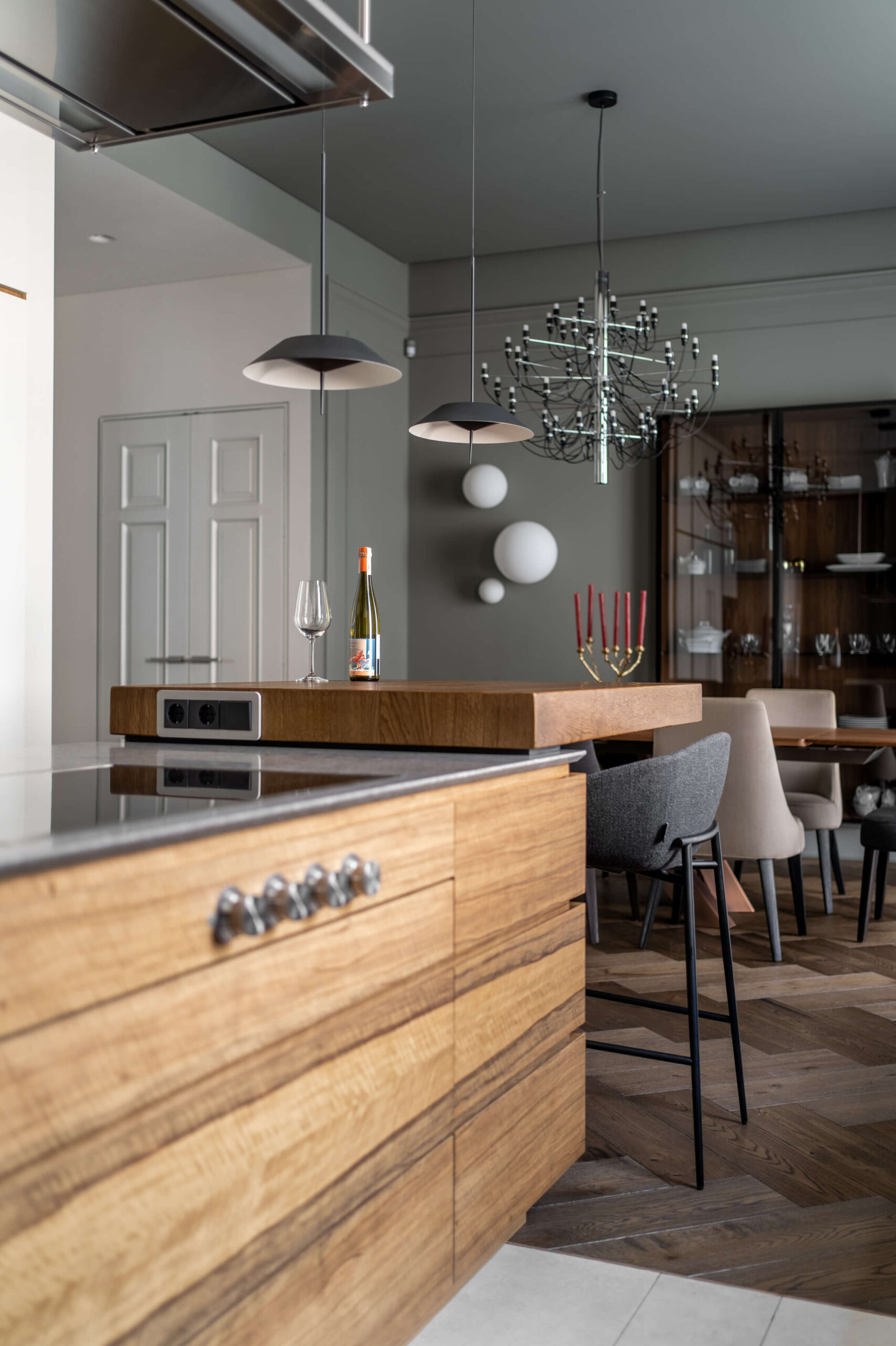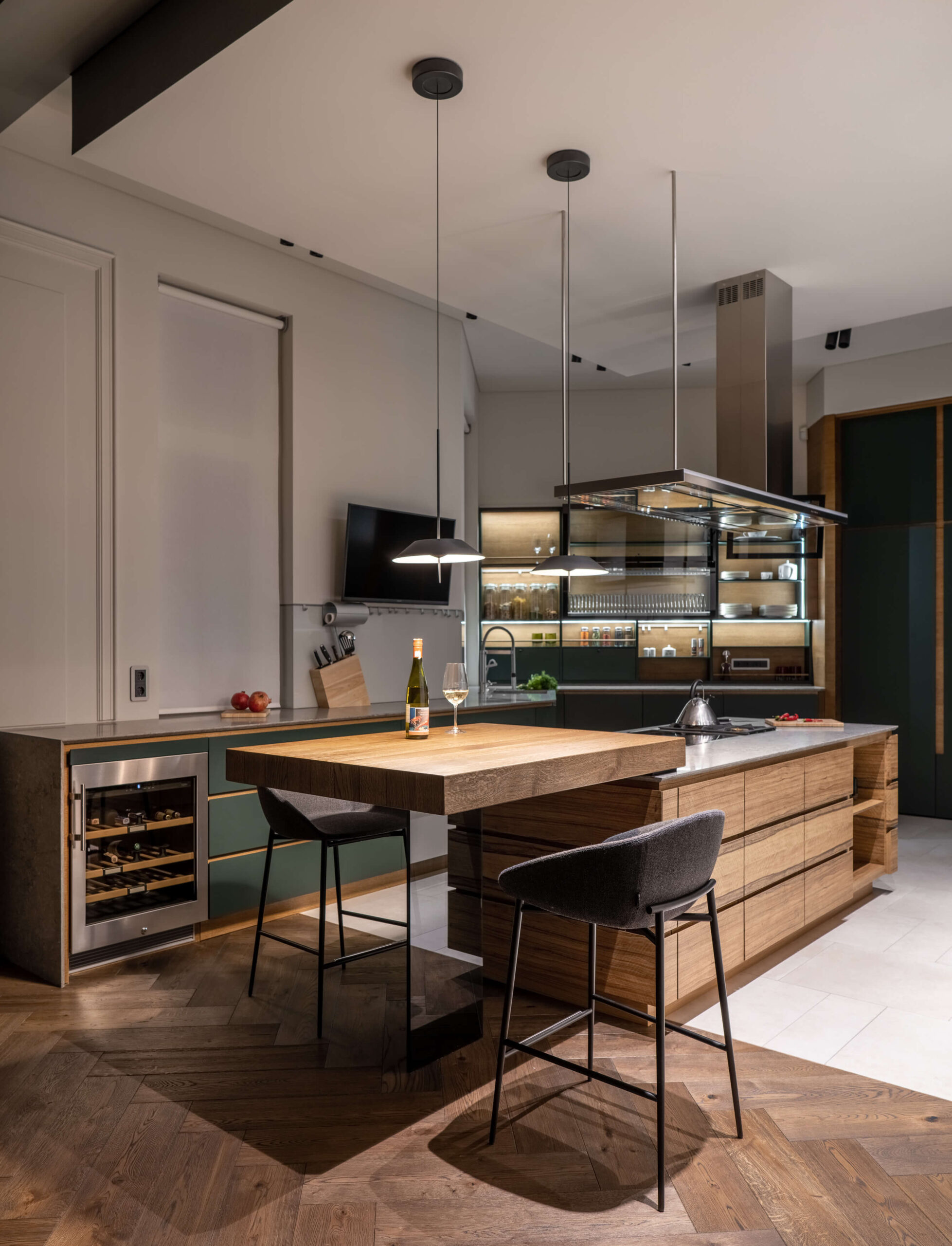 Реалізований проєкт від студії дизайну та архітектури Replus bureau,  в якому поєднали класичні форми з сучасним технологічним наповненням. Даний проект кухні поділено на дві зони: технічну зону з високими шафами та прихованою коміркою і відкриту частину кухні, де розташований острів. Кухонні зонни виготовлені із струганого шпону ЛІМБА ЧОРНА ФІГУРНА, завдяки якому, кожен елемент цього дизайну підкреслив гармонійність та довершеність!
