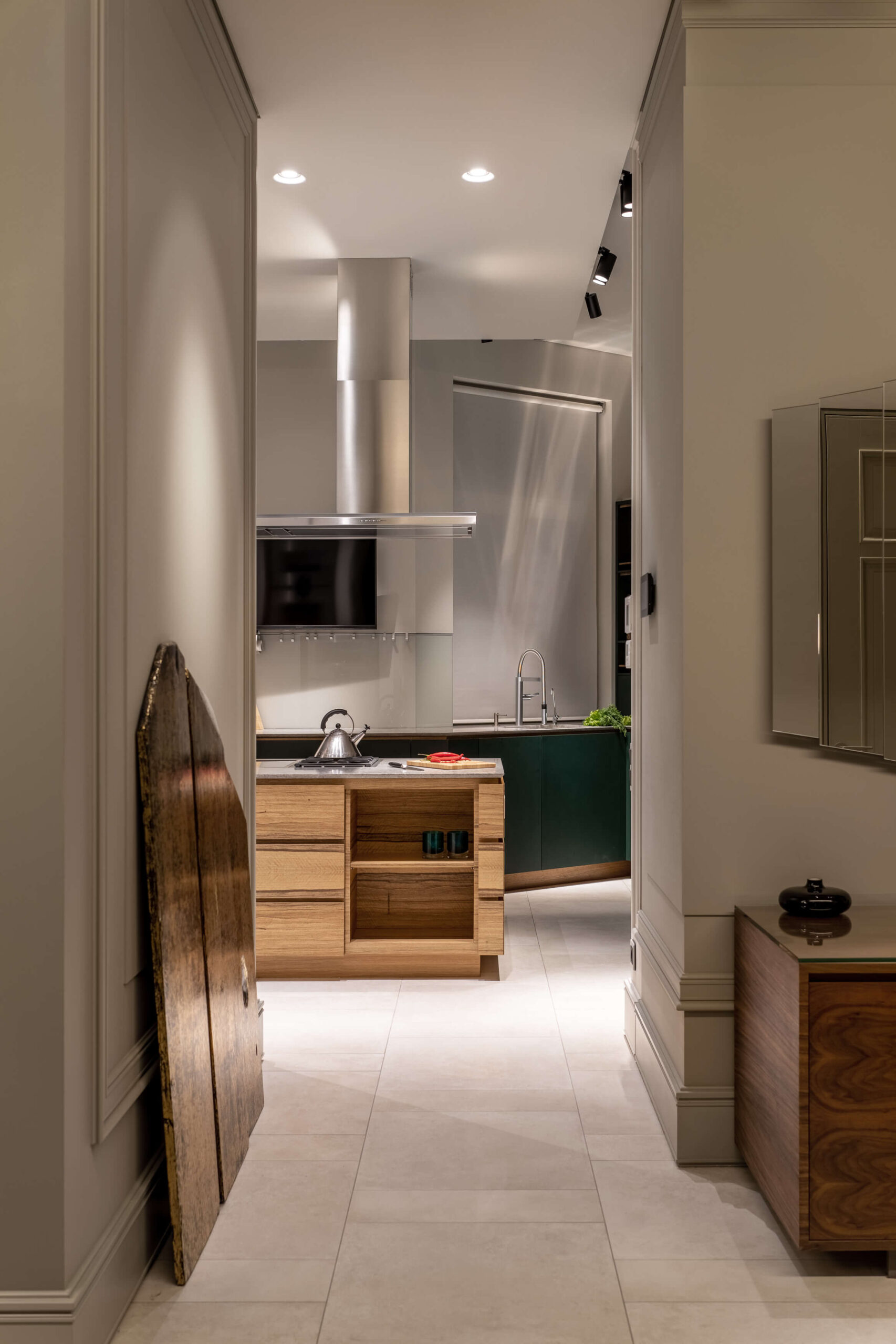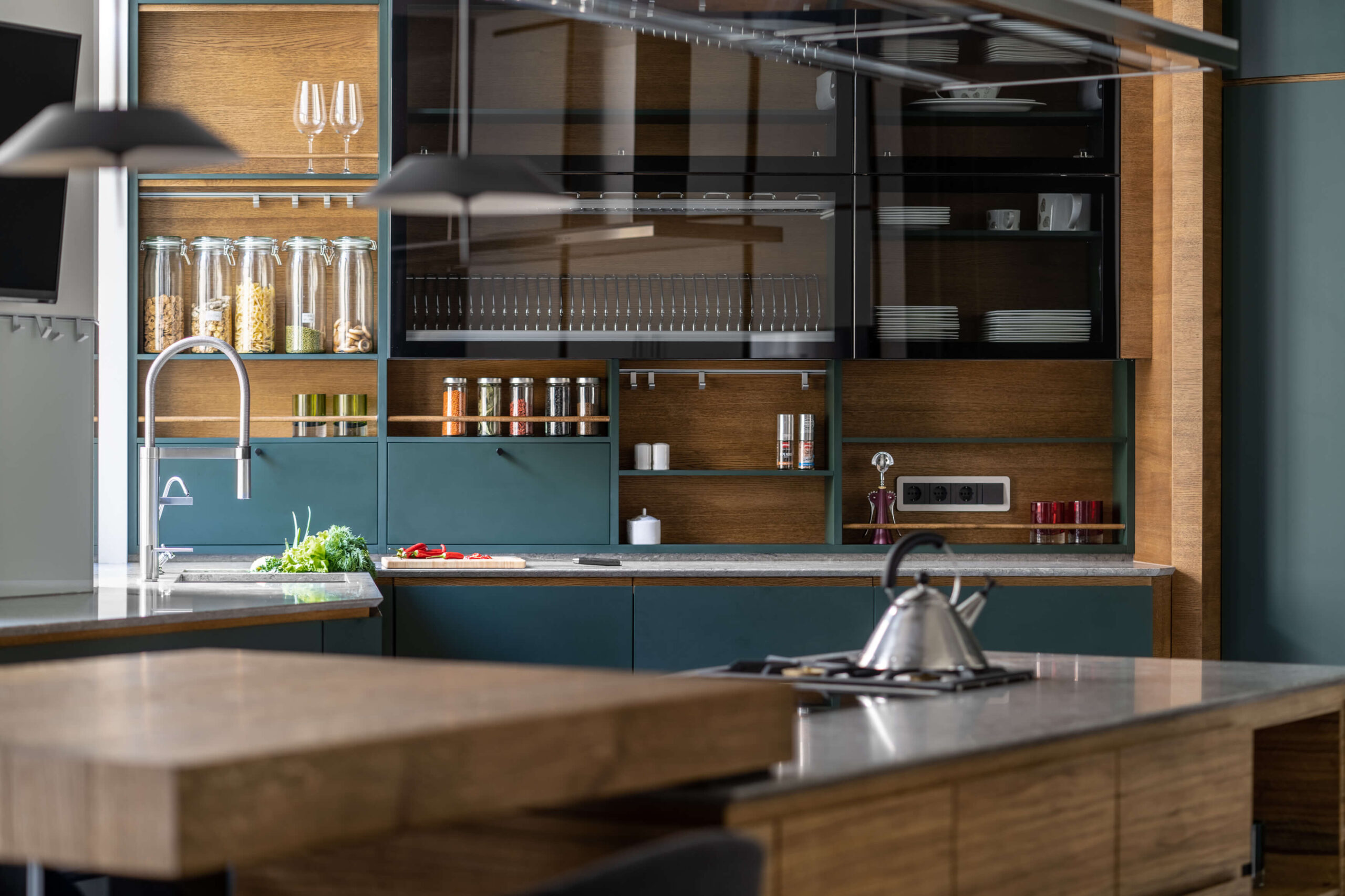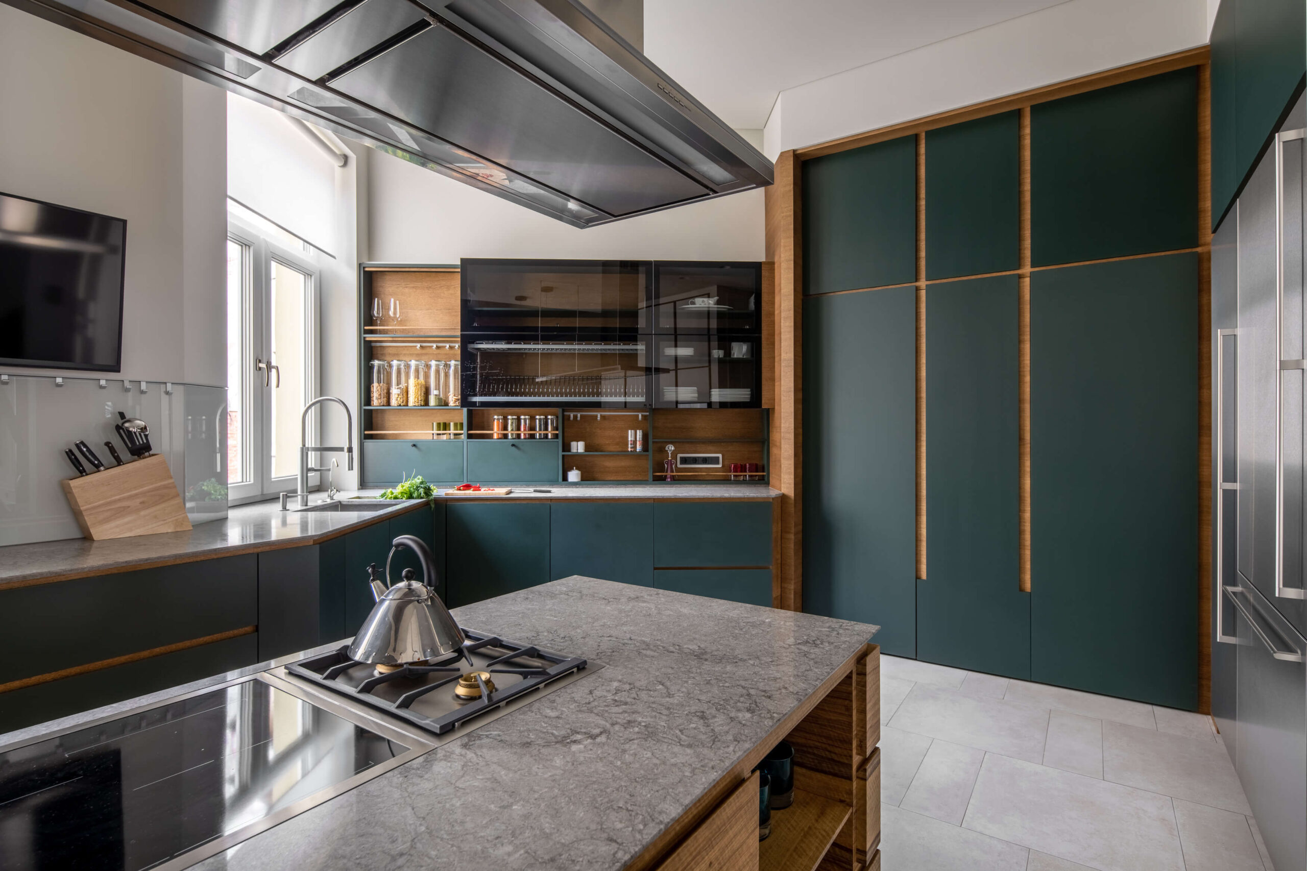 Реалізований проєкт від студії дизайну та архітектури Replus bureau,  в якому поєднали класичні форми з сучасним технологічним наповненням. Даний проект кухні поділено на дві зони: технічну зону з високими шафами та прихованою коміркою і відкриту частину кухні, де розташований острів. Кухонні зонни виготовлені із струганого шпону ЛІМБА ЧОРНА ФІГУРНА, завдяки якому, кожен елемент цього дизайну підкреслив гармонійність та довершеність!