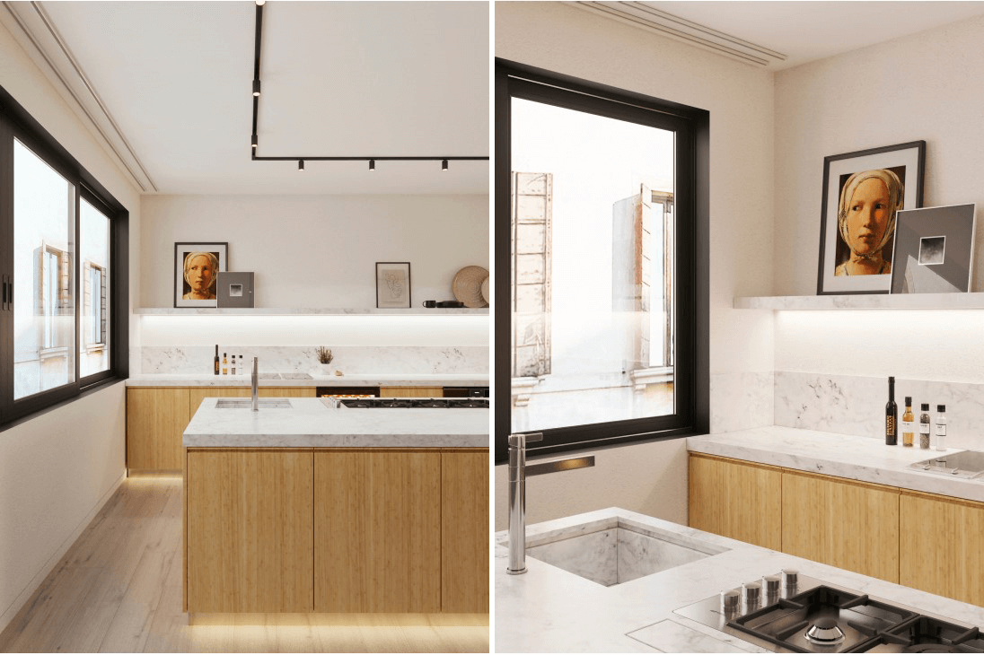 Інтер’єр представленої кухні наповнений світлими та м’якими кольорами. Кухонний простір використаний з максимальною користю не лише для практичності але й для зручного догляду. Окремою яскравою особливістю є шпоновані фасади, які доповнюють приміщення природністю та натуральністю. Такі відтінки допомагають розслабитися, даруючи тепло і затишок. Освітлення кухні в поєднанні з м’якими кольорами надає приміщенню свіжість та збалансованість.