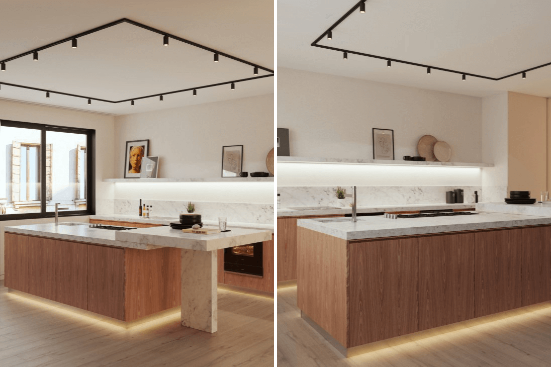 Інтер’єр представленої кухні наповнений світлими та м’якими кольорами. Кухонний простір використаний з максимальною користю не лише для практичності але й для зручного догляду. Окремою яскравою особливістю є шпоновані фасади, які доповнюють приміщення природністю та натуральністю. Такі відтінки допомагають розслабитися, даруючи тепло і затишок. Освітлення кухні в поєднанні з м’якими кольорами надає приміщенню свіжість та збалансованість.