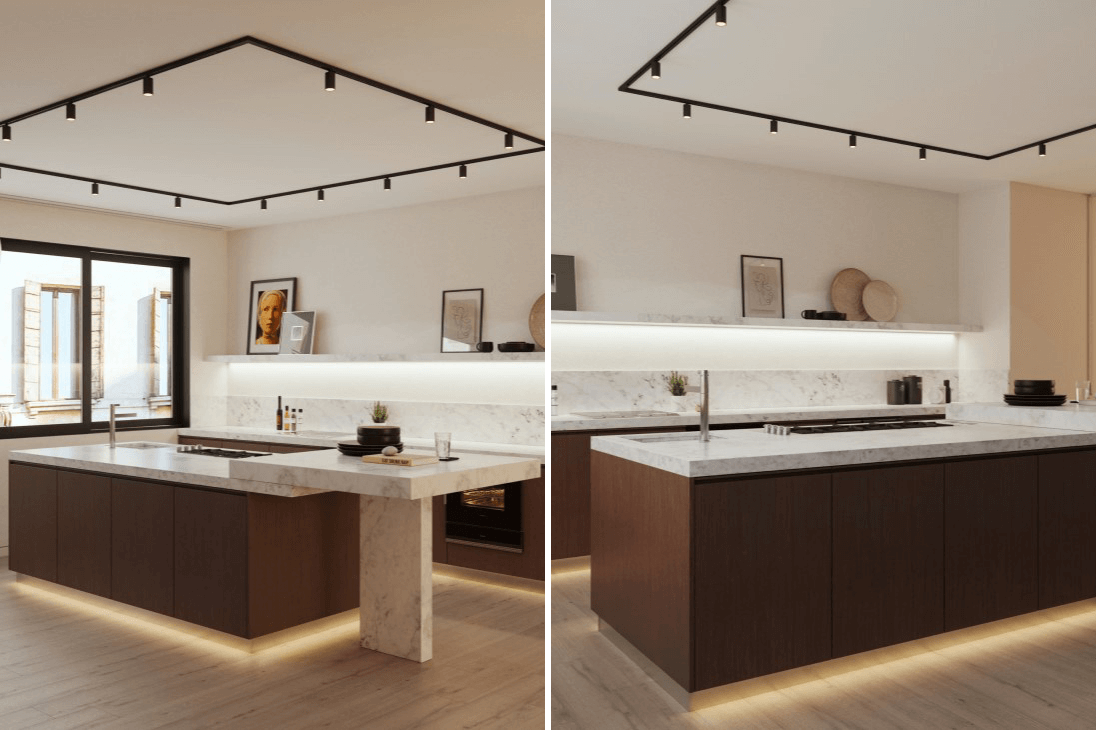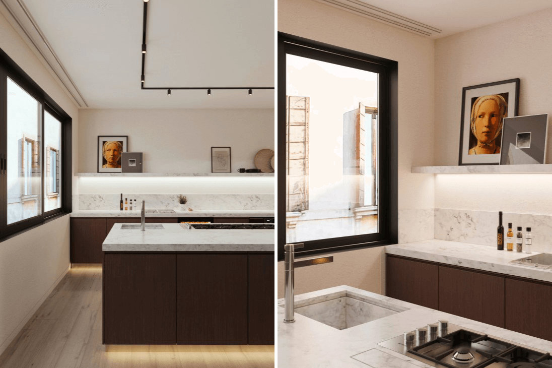 Інтер’єр представленої кухні наповнений світлими та м’якими кольорами. Кухонний простір використаний з максимальною користю не лише для практичності але й для зручного догляду. Окремою яскравою особливістю є шпоновані фасади, які доповнюють приміщення природністю та натуральністю. Такі відтінки допомагають розслабитися, даруючи тепло і затишок. Освітлення кухні в поєднанні з м’якими кольорами надає приміщенню свіжість та збалансованість.