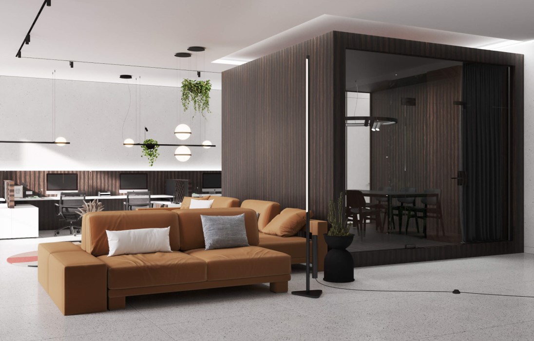 У даному проекті природний відтінок шпону ЕБЕН РАДІАЛЬНИЙ ШИРОКИЙ надає офісу ергономічності. Адже у таких приміщеннях справді зручно створювати і працювати в команді із задоволенням!