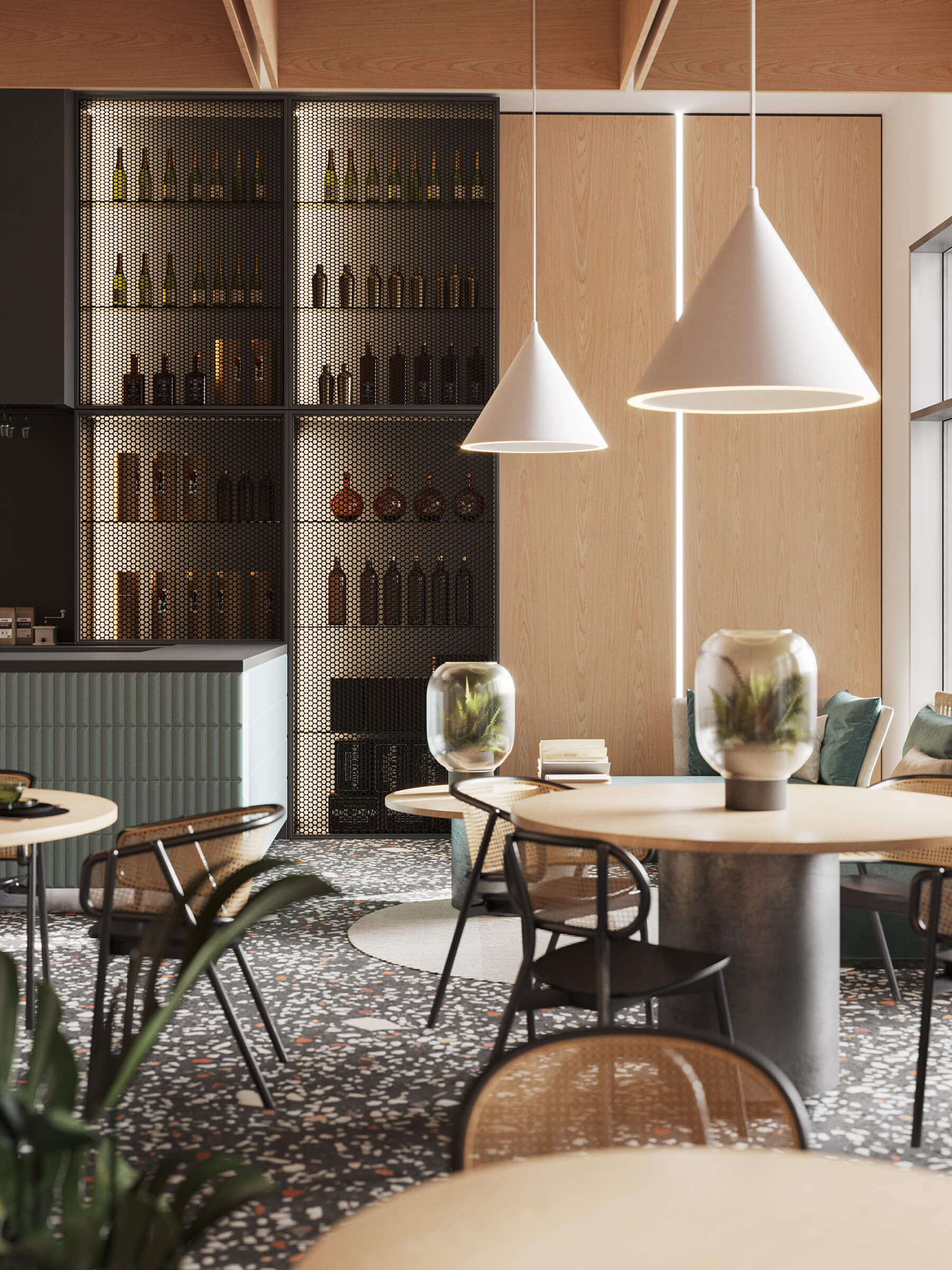 Проект з красивим поєднанням шпону ДУБ ТАНГЕНТАЛ на стінових панелях, що надихає на особливо теплі відчуття та передають по-справжньому затишну і теплу атмосферу кафе.