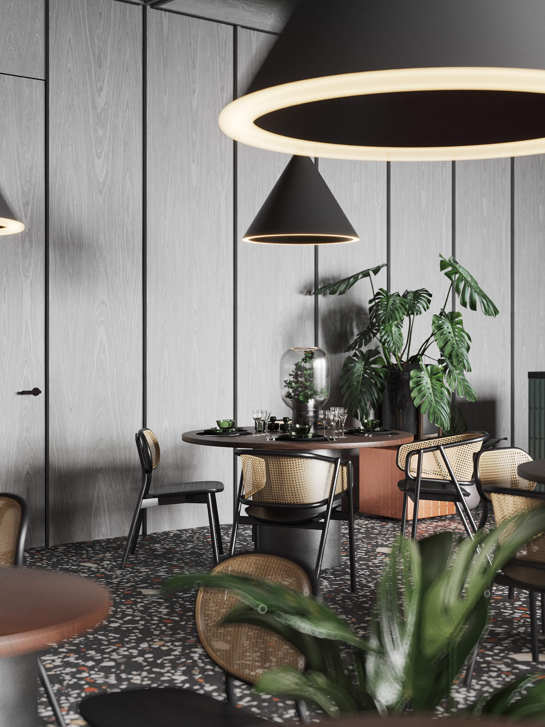 ПопереднійПроект з красивим поєднанням шпону ДУБ ВІНТЕР на дверях та стінових панелях, що надихає на особливо теплі відчуття та передають по-справжньому затишну і теплу атмосферу кафе.