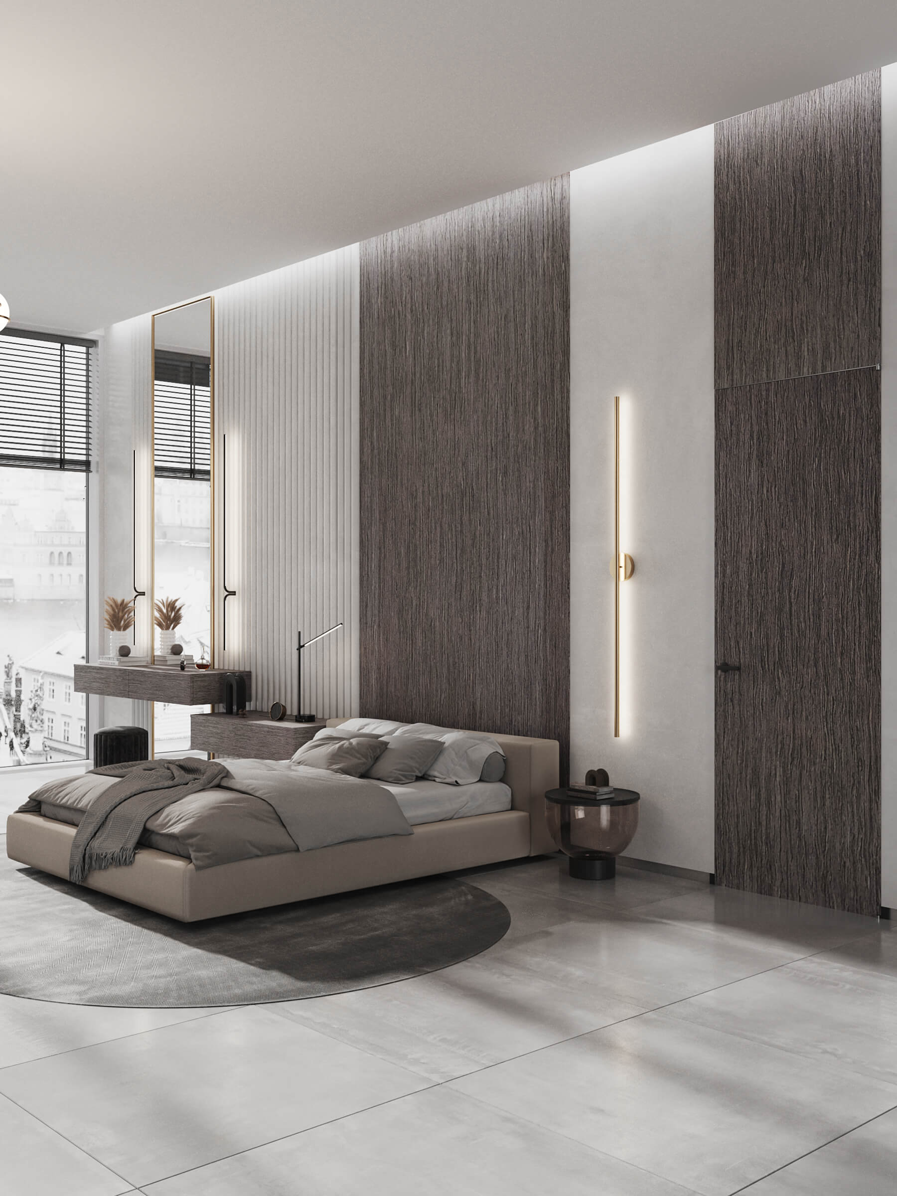 ПопереднійНіжний дизайн поверхонь, дверей та меблів в поєднанні з шпонованими елементами надають простору атмосферу легкості, релаксу та налаштовують на відпочинок. Структура та колір модифікованого шпону ГОРІХ КАТАНІЯ додає бажаного ефекту особливої розкоші у простоті спальні.