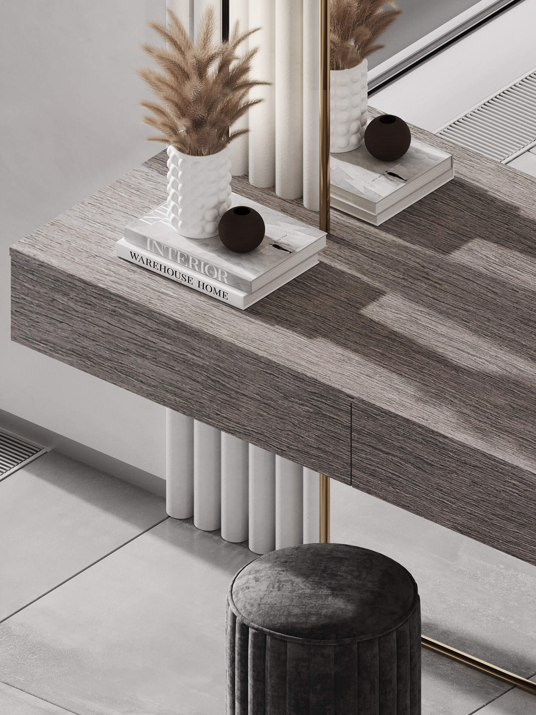 ПопереднійНіжний дизайн поверхонь та меблів в поєднанні з шпонованими елементами надають простору атмосферу легкості, релаксу та налаштовують на відпочинок. Структура та колір модифікованого шпону ГОРІХ КАТАНІЯ додає бажаного ефекту особливої розкоші у простоті спальні.